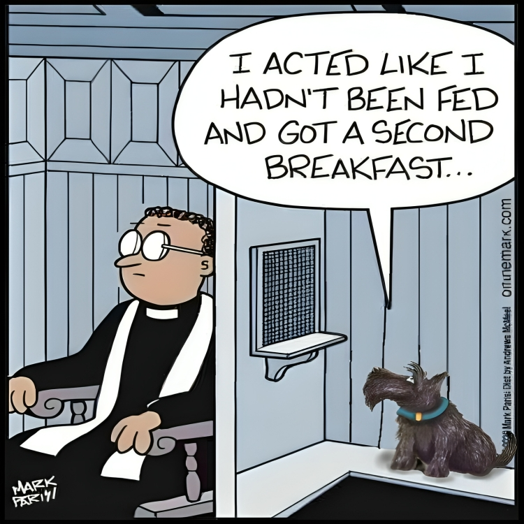 What makes this cartoon particularly funny is the juxtaposition of the solemn setting of a confession booth with the lighthearted and cunning confession of the dog. The idea of a dog seeking forgiveness for its crafty behavior adds a layer of absurdity and charm to the scene.